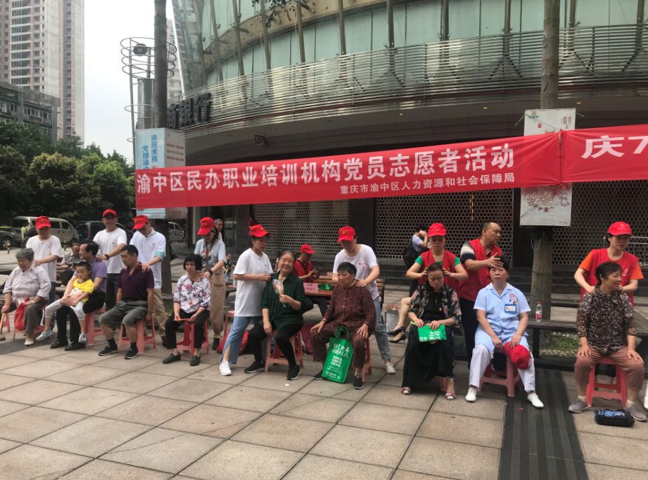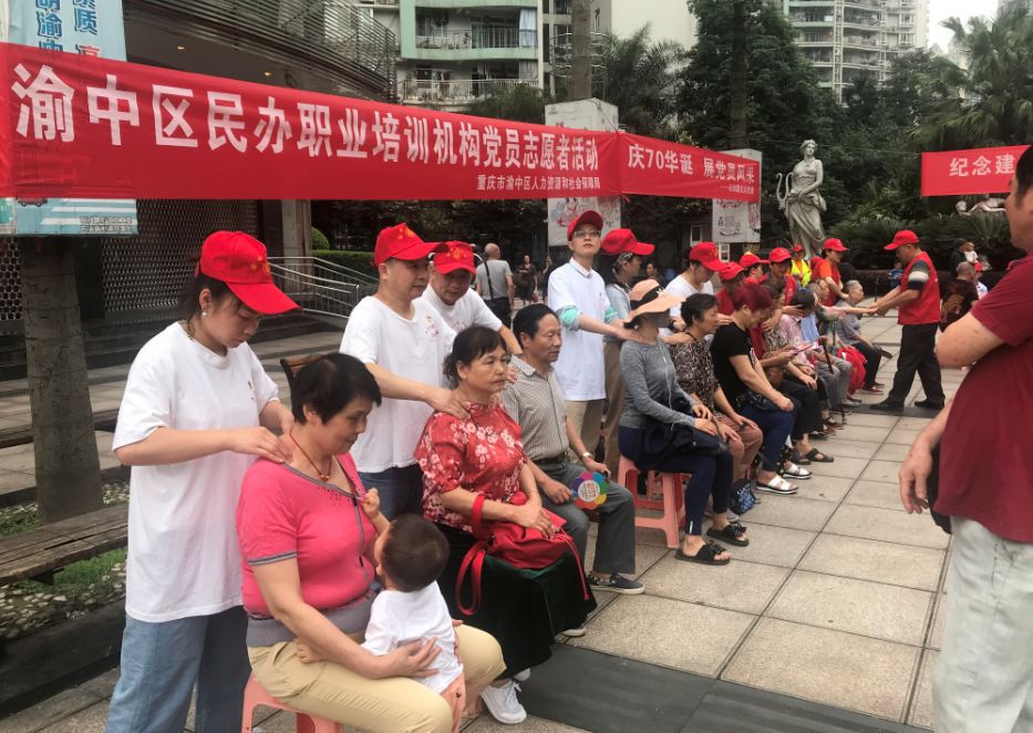 为庆祖国70华诞,展现党员风采,重庆市六合职业培训学校在何林惠校长的带领下积极参与此次义诊活动,包含中医适宜技术、中医诊疗、中医知识宣传等。