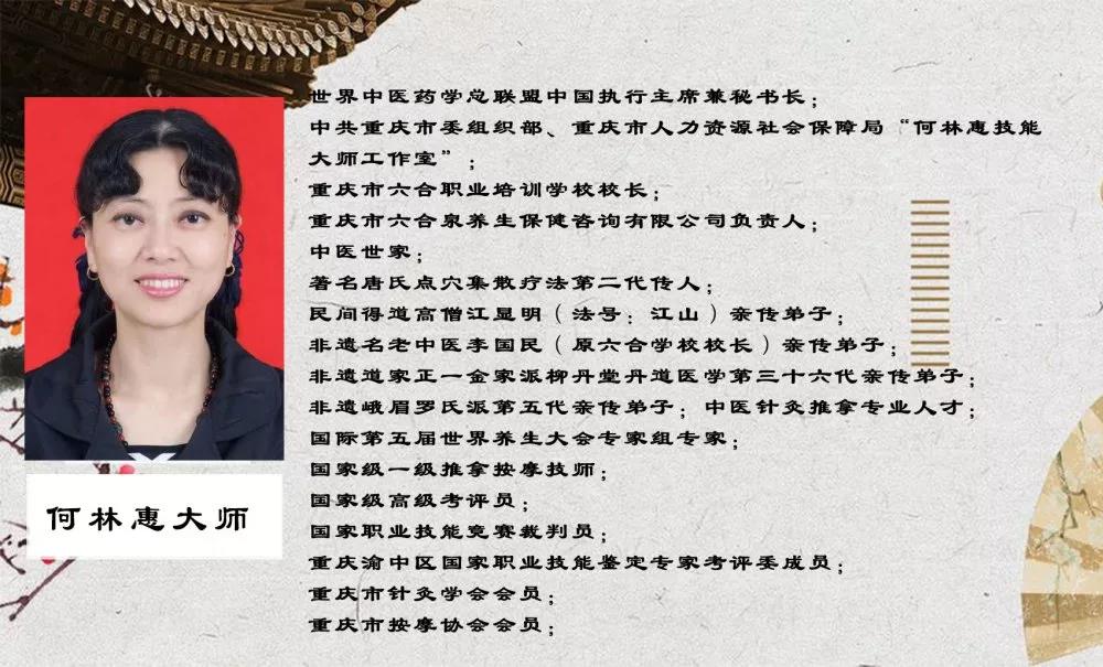 何林惠校长于2018年获得中共重庆市委组织部、重庆市人力资源社会保障局等授予的市级“何林惠技能大师工作室”殊荣!2019年其民间绝技“五行能量液体疗法”获批重庆市人力资源社会保障局特色职业工种!