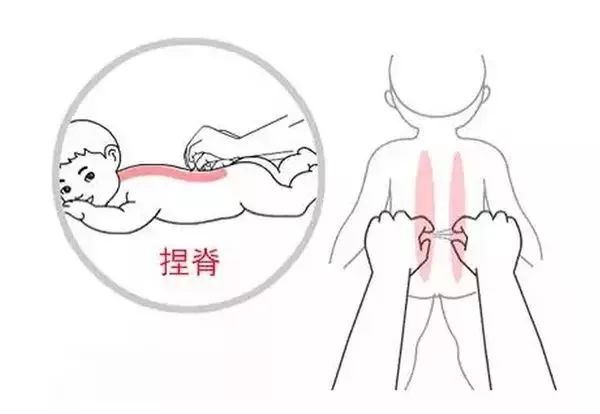 手法:捏脊的方式有两种,一种拇指在前,拿-提-捏-放,左右交换,波浪状前进。捏的时候,拇指向前,与食指轻扣在一起,用食指的指间关节轻轻地贴着皮肤,用拇指轻轻提着皮肤。捏的时候,要根据孩子皮肤的松紧度和胖瘦程度,做到拿捏有度。