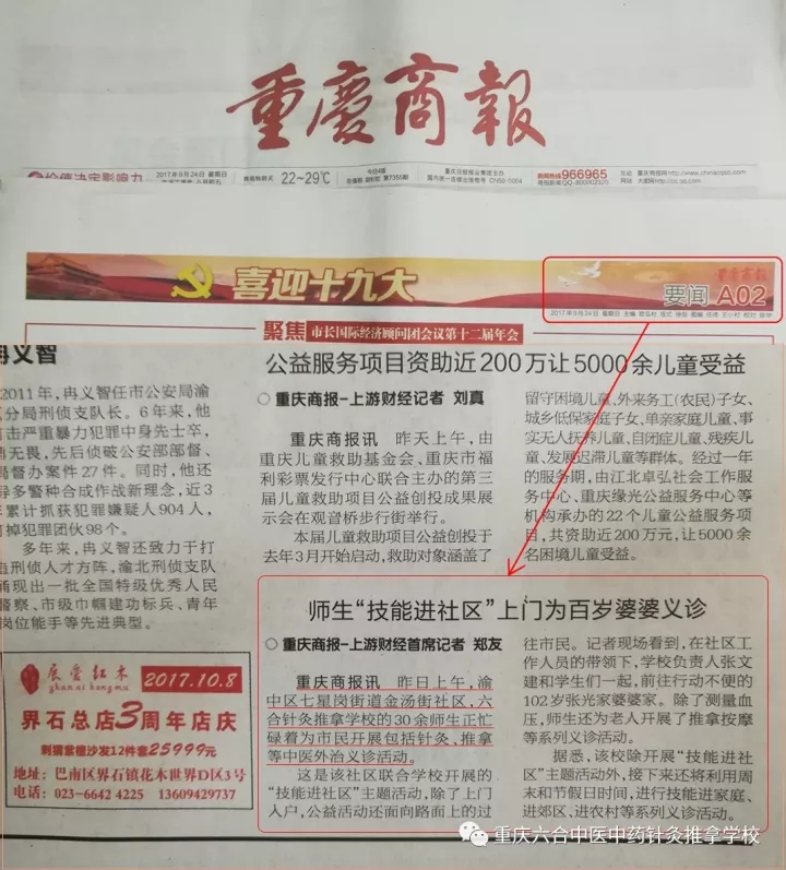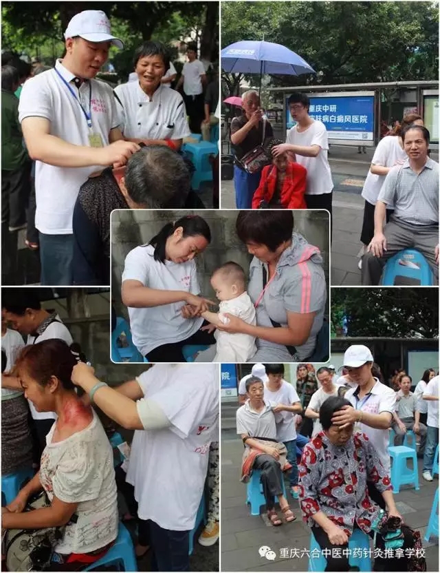 重庆商报讯 昨日上午,渝中区七星岗街道金汤街社区,六合针灸推拿学校的30余师生正忙碌着为市民开展包括针灸、推拿等中医外治义诊活动。