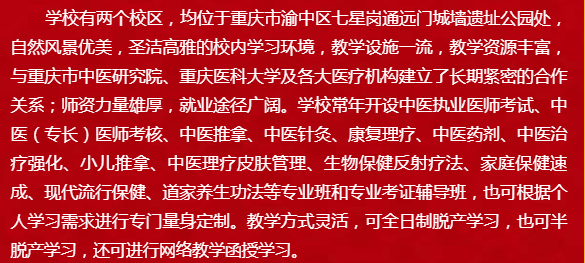 地址:一校区重庆市渝中区七星岗金汤街53号(通远门金汤大厦) 二校区重庆市渝中区七星岗金汤街通远楼底层(妇幼保健院旁)
