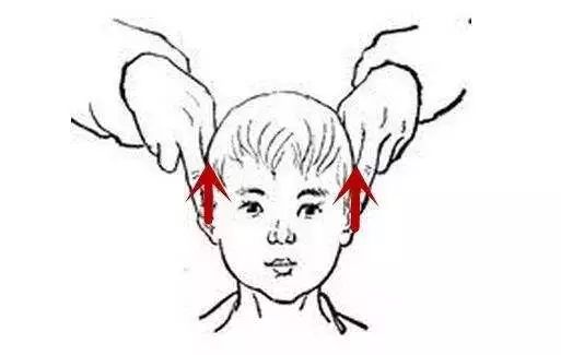 操作方法:是用双手的食指、中指侧面夹住小孩子的耳尖向上提10-20次,再捏两下耳垂向下扯10-20次,如猿猴摘果之状。