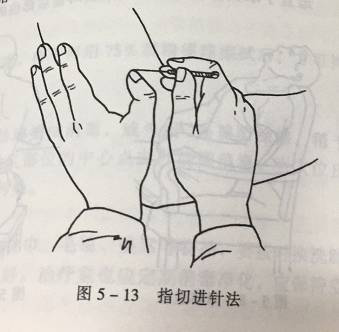 (1)爪切进针法 又称指切进针法,用左手拇指或食指端切按在腧穴位置上,右手持针,紧靠左手指甲缘迅速针刺入腧穴,此法在临床上最为常用,适用于短针。