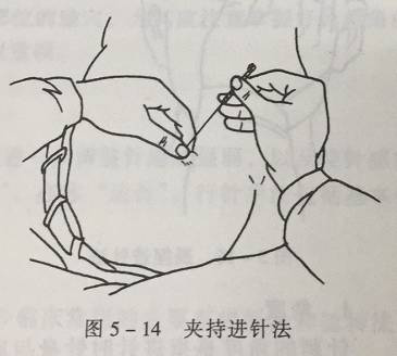 (2)夹持进针法多用于3寸以上长针,左手拇指、食指捏持针体下段,右手拇指、食指持针柄,将针尖对准穴位,双手配合迅速将针刺入皮下,直至需求深度。