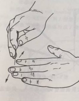 (3)舒张进针法 用左手食、中二指或拇、食二指将所刺腧穴部位的皮肤向侧撑开,使皮肤绷紧,右手持针,使针从左手食、中二指或拇、食二指的中间刺入。此法主要用于皮肤松弛或有皱纹处,绷紧皮肤有利于进针。