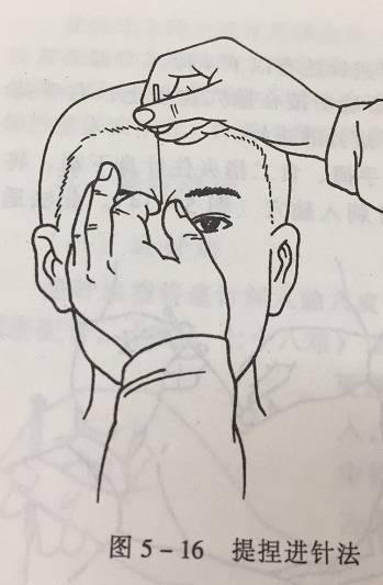 (4)提捏进针法 用左手拇食二指将所刺腧穴部位的皮肤轻轻提起,右手持针,从捏起的上端将针刺入,此法主要用于皮肤浅薄部位的腧穴,如面部穴位进针,如印堂穴。